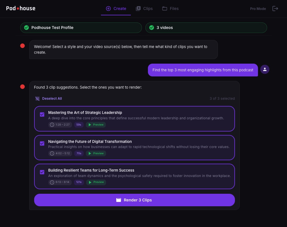 Podhouse's proprietary AI Director is the most advanced clip editing software on the market that can be controlled with natural language.